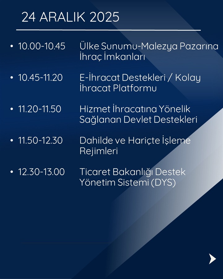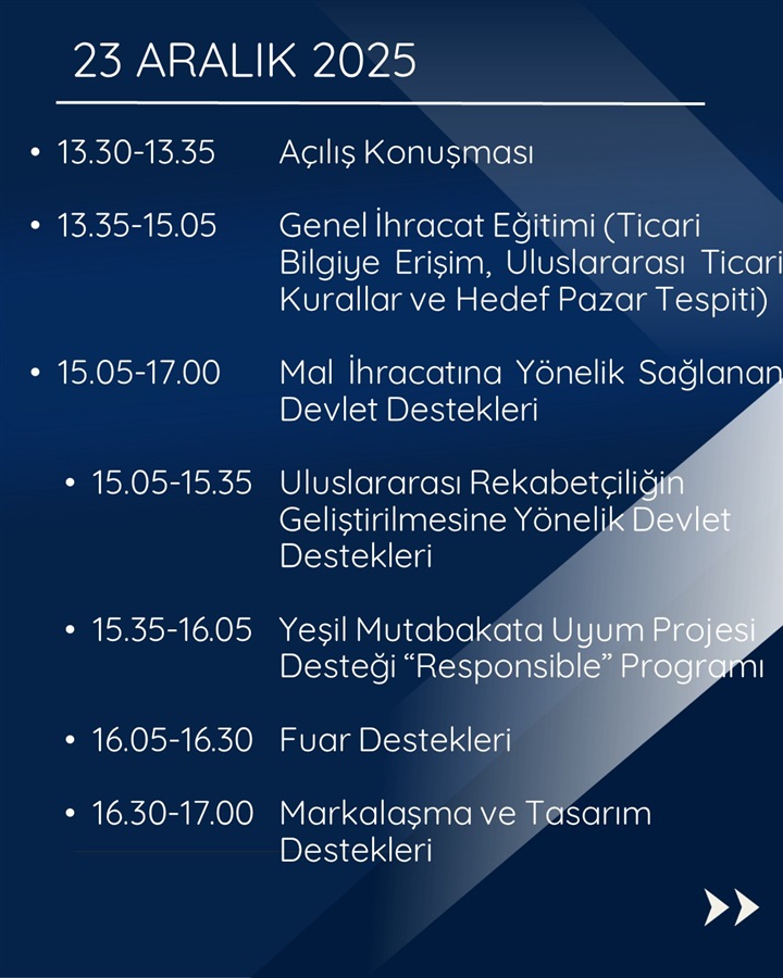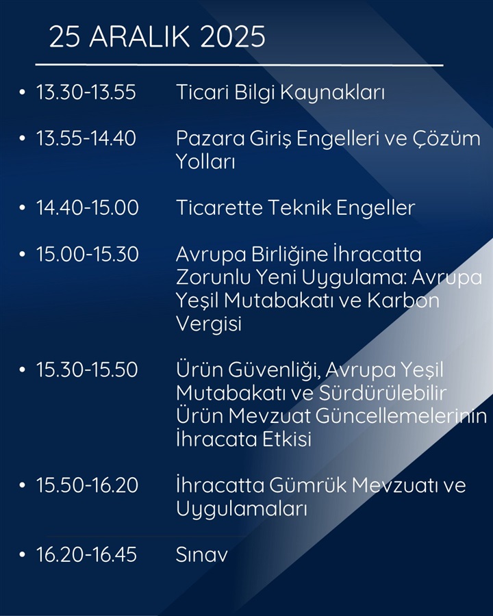 Türkiye Odalar ve Borsalar Birliği (TOBB) tarafından iletilen yazıda, Ticaret Bakanlığı tarafından 23-24-25 Aralık 2025 tarihlerinde “İhracat Süreçleri ve Devlet Destekleri Eğitim Programı” nın çevrimiçi olarak gerçekleştirileceği bildirilmiştir.