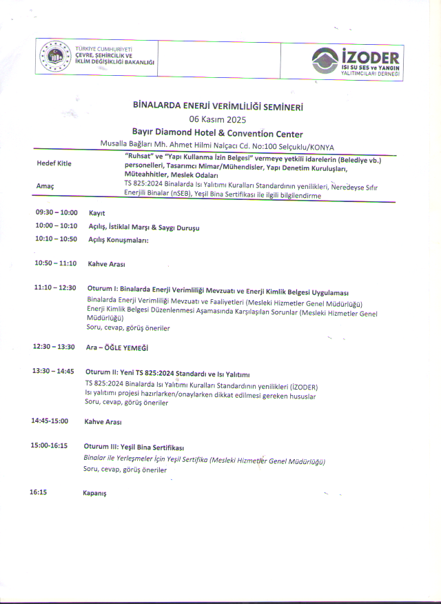 Home Announcements (Turkish) BİNALARDA YALITIM UYGULAMALARI VE İYİ UYGULAMA KURALLARINA İLİŞKİN FARKINDALIĞIN ARTIRILMASI SEMİNERİ