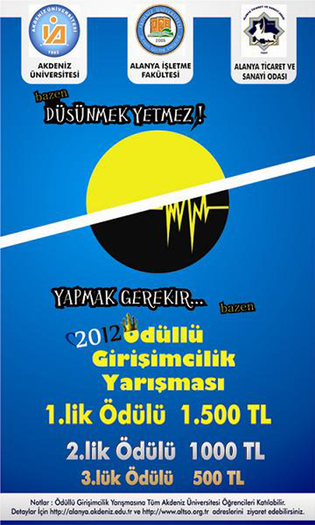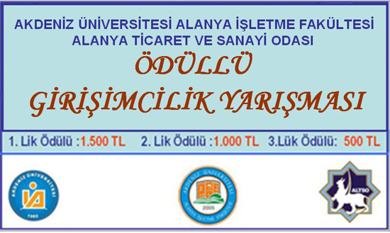 Akdeniz Üniversitesi Alanya İşletme Fakültesi ve Alanya Ticaret ve Sanayi Odası işbirliğinde Akdeniz Üniversitesi öğrencileri arasında ‘’Ödüllü Girişimcilik Yarışması’’ organize edilmiştir. Akdeniz üniversitesi öğrencileri arasında girişimcilik kültürünün yaygınlaştırılması, iş planı ve iş kurma süreçleri ile ilgili eğitim bilgilerinin pekiştirilmesi, yeni iş fikirleri ortaya çıkarma ve bunları sunma becerilerinin geliştirilmesi amacı ile düzenlenen yarışmanın birincisine 1.500 TL; İkincisine 1.000 TL ve Üçüncüsüne de 500 TL ödül verilecek Yarışmaya sadece Akdeniz Üniversitesi, (ön lisans, lisans ve lisansüstü seviyesi) öğrencileri katılabilecektir. Yarışmaya katılacak projelerin son teslim tarihi 23.Mart 2012 Saat:17.00 olarak belirlenmiştir. Ayrıntılı Bilgi ve Danışma İçin: