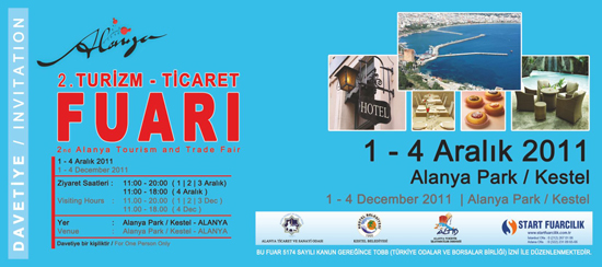 İlçemizde böyle bir organizasyonla ilk kez gerçekleştirilen bu fuarın ardından, üyelerimizden ve kamuoyundan gelen talepler doğrultusunda, Start Fuarcılık organizasyonunda çalışmalara başlanmış ve 2. Alanya Turizm ve Ticaret Fuarı’nın, 01-04 Aralık 2011 tarihinde gerçekleştirmek üzere, gerekli izin ve destekler sağlanarak hazırlıklar tamamlanmıştır. Bu yıl hizmet sektörü, tekstil, mobilya ve dekorasyon, bakım, temizlik, güzellik, spor, inşaat, yapı, peyzaj, ısıtma ve soğutma, elektrik, güvenlik sistemleri, gıda, mutfak ekipmanları ve otomotiv ürünlerinin sergileneceği ve Alanya’nın ticari hayatına katkı sağlayacağı düşünülen fuarın, açılışı 1 Aralık 2011 Perşembe Günü Saat:14.00 de Kestel Beldesi Alanya Park Karting’de gerçekleştirilecek Açılışa tüm üyelerimiz ve halkımız davetlidir.