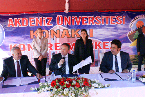 Alanya Ticaret ve Sanayi Odası desteğiyle,  Konaklı Belediyesi tarafından yapılan Kültür Sarayının Akdeniz Üniversitesi’ne devredilerek Kongre Merkezi Olarak işletilmesine ilişkin protokol, bu gün görkemli bir törenle Konaklı Belediyesi önünde yapıldı. Protokol A.Ü. Rektörü Prof. Dr. İsrafil Kurtcephe, Konaklı Belediye Başkanı Abdullah Sönmez ve ALTSO Başkanı Kerim Aydoğan tarafından imzalandı.
