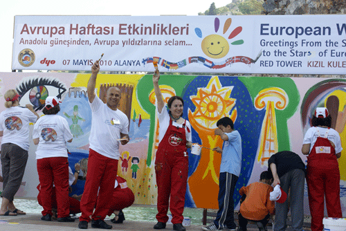 “Anadolu Güneşinden Avrupa Yıldızları’na Selam” konu başlıklı etkinliğe ilçemizde yaşayan yerli ve yabancılar büyük ilgi gösterdi. Organizasyona Alanya Kaymakamı Hulusi Doğan, Alanya Cumhuriyet Başsavcısı Ali Yeldan, Odamız Başkanı Kerim Aydoğan ve Yönetim kurulu Üyeleri ile Meclis Başkanı Mustafa Tuna, Alanya Belediye Başkan Vekili Kadriye Görücü, ALTİD Yönetim Kurulu ve ilçemizde bulunan sivil toplum kuruşları temsilcileri de iştirak etti. Kızılkule yanındaki alanda yapılan etkinlikte değişik ülkelerden 20 yabancı uyruklu ve yerli katılımcı tarafından 10.00 x 1.80 metre boyutunda bir tuval üzerine resim çalışması yapıldı ve yine ilçemizde yaşayan Avrupalılardan oluşan bir gurup da Avrupa Birliği Marşı olan Beethoven 9.Senfonisini seslendirdi.
