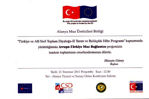 AVRUPA – TÜRKİYE MUZ BAĞLANTISI PROJESİ ANLATILACAK Türkiye ve AB Sivil Toplum Diyaloğu – II tarım ve Balıkçılık Hibe Programı” kapsamında  Alanya Muz Birliği’nin “Avrupa-Türkiye Muz Bağlantısı” isimli projesinin tanıtım Toplantısı 21 Temmuz Perşembe günü saat 12:00’da ALTSO Konferans Salonu’nda yapılacak. Toplantıya Avrupa Birliği Bakanı olarak görevlendirilen  Baş Müzakereci Egemen Bağış ve Antalya Milletvekili AKPM Başkanı Mevlüt Çavuşoğlu’nun katılacağı açıklandı.
