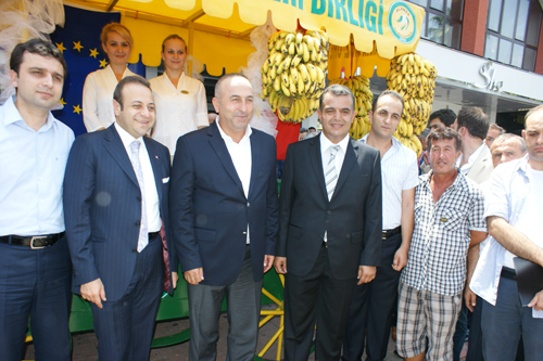 BAĞIŞ VE ÇAVUŞOĞLU’NUN KATILIMI İLE PROJE AÇILIŞI Odamızda düzenlenen Alanya Muz Üreticileri Birliği’nin Avrupa Türkiye Muz Bağlantısı Projesi tanıtım toplantısına katılmak üzere beraberinde AKPM Başkanı Mevlüt Çavuşoğlu ile birlikte Odamızı ziyaret eden Avrupa Birliği (AB) Bakanı Egemen Bağış’a Oda Başkanımız Kerim Aydoğan tarafından ziyaretleri anısına odamız adına şükran plaketi takdim edildi.