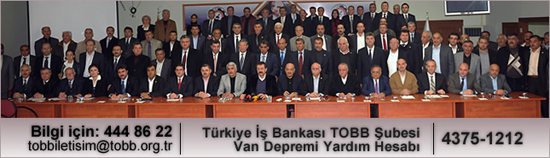 TOBB, VAN DEPREMİ İÇİN 1 MİLYON TL NAKDİ YARDIM YAPIYOR. 25 MİLYON TL DE FAİZSİZ KREDİ DESTEĞİ VERİYOR Türkiye Odalar ve Borsalar Birliği, Van depreminden zarar gören vatandaşlarımız için ayni ve nakdi yardım, faizsiz kredi desteği ve acil ihtiyaçlara yönelik kapsamlı bir yardım kampanyası başlattı.